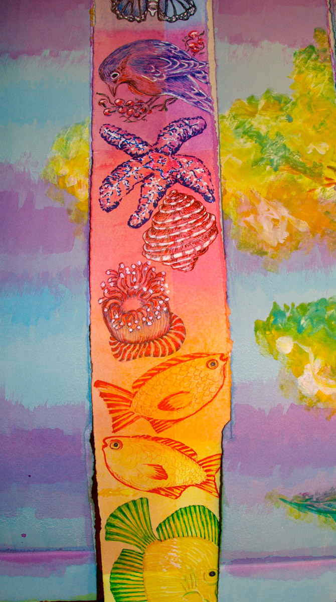 26 Icons on the strips, Fish, Star Fish, Birds,colored pens, markers, acrylic paint.